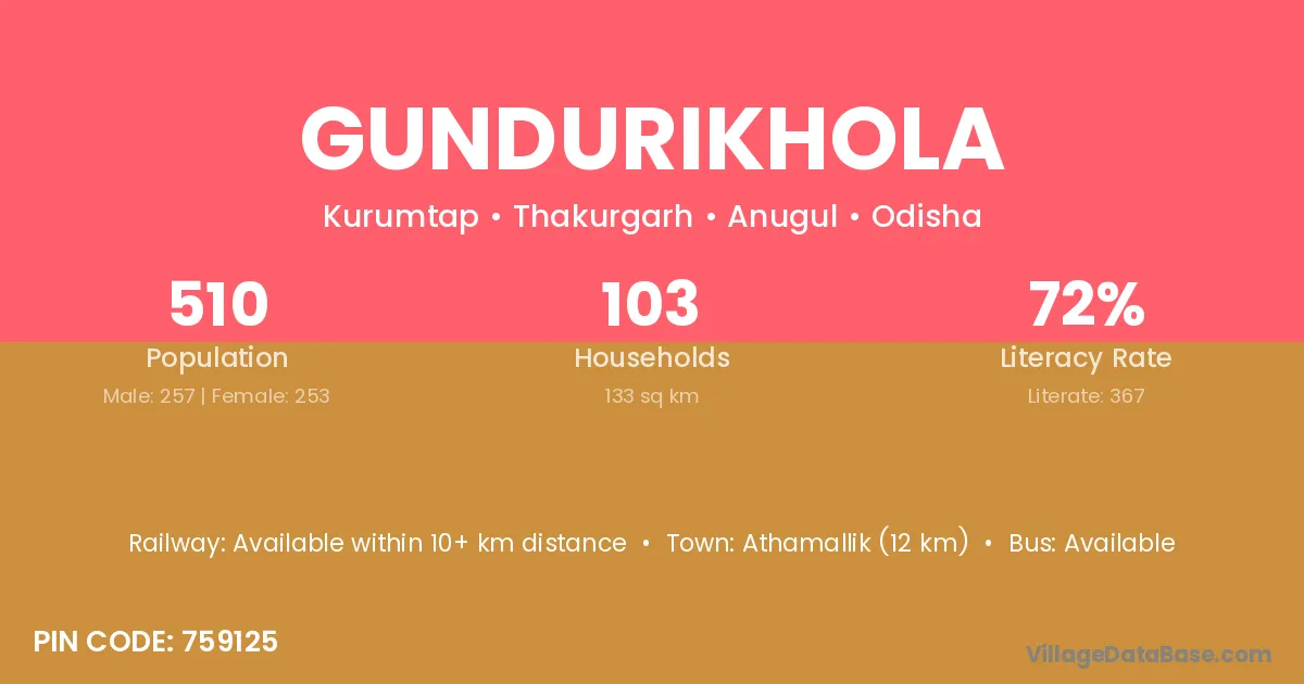Athamallik (12 km) is the nearest town to Gundurikhola village for major economic activities and is located approximately 12 km away.