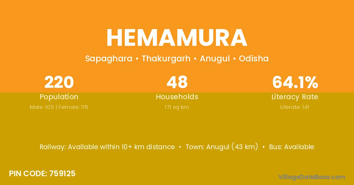 Anugul (43 km) is the nearest town to Hemamura village for major economic activities and is located approximately 43 km away.