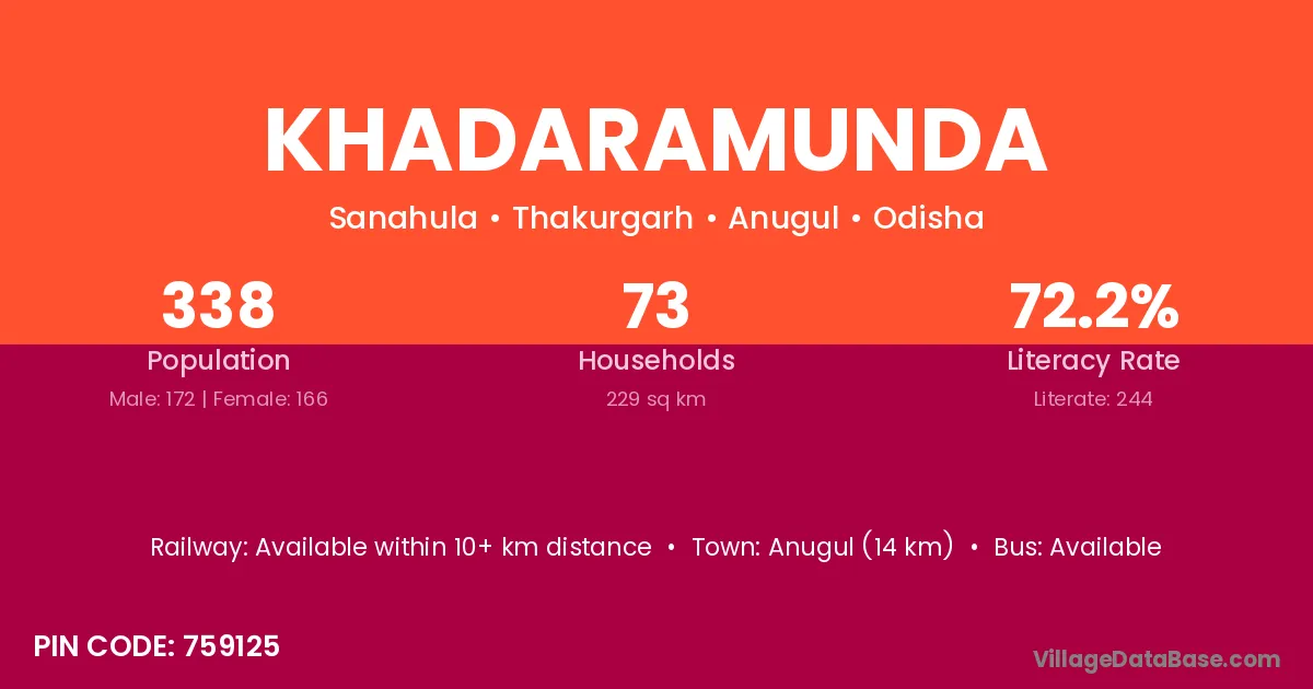 Anugul (14 km) is the nearest town to Khadaramunda village for major economic activities and is located approximately 14 km away.