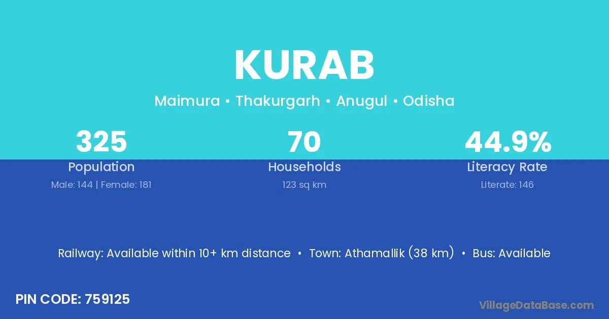 Athamallik (38 km) is the nearest town to Kurab village for major economic activities and is located approximately 38 km away.