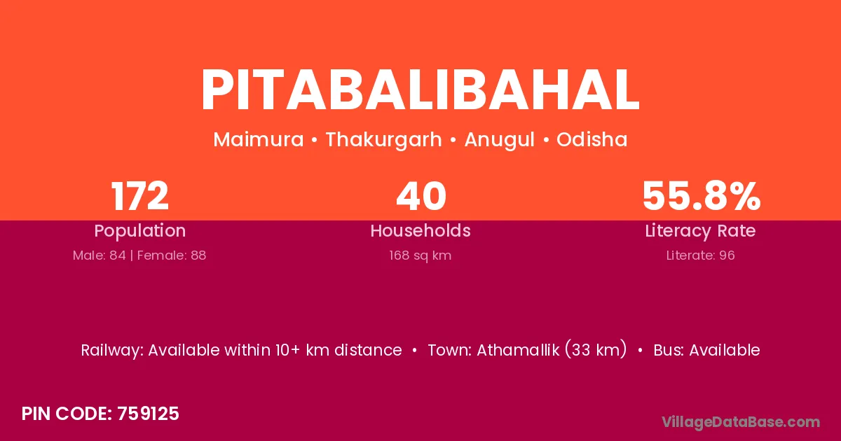 Pitabalibahal village has a total population of 172 people, of which 84 are males and 88 are females.