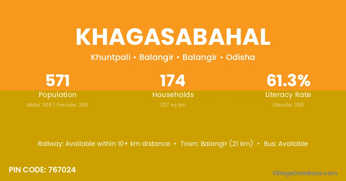 Balangir (21 km) is the nearest town to Khagasabahal village for major economic activities and is located approximately 21 km away.