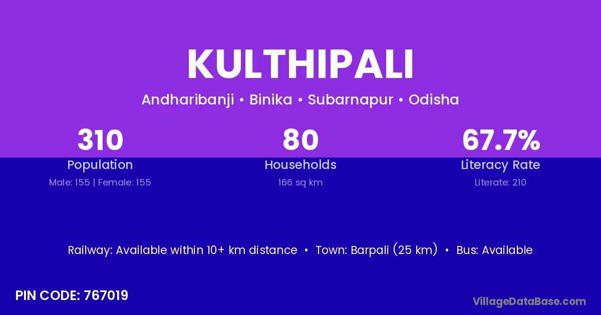 Balangir (23 km) is the nearest town to Kulthipali village for major economic activities and is located approximately 23 km away.