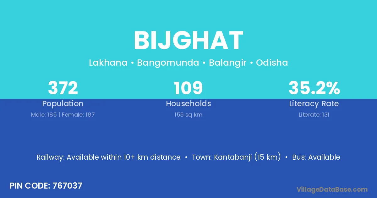 Kantabanji (15 km) is the nearest town to Bijghat village for major economic activities and is located approximately 15 km away.
