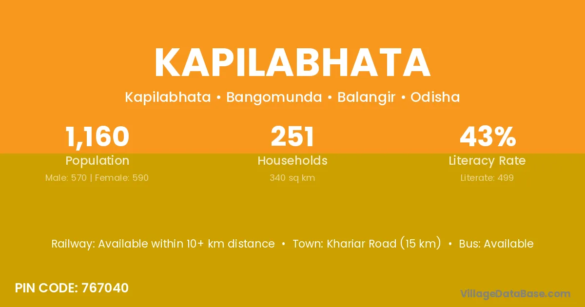 Khariar Road (15 km) is the nearest town to Kapilabhata village for major economic activities and is located approximately 15 km away.