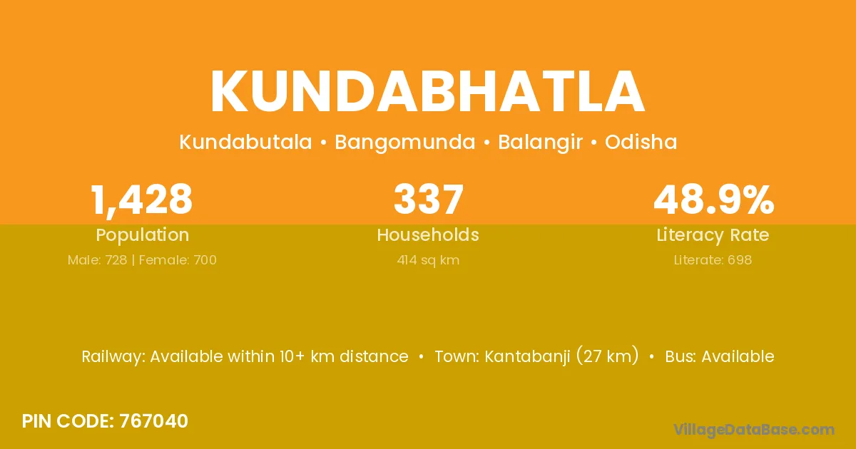 Kantabanji (27 km) is the nearest town to Kundabhatla village for major economic activities and is located approximately 27 km away.