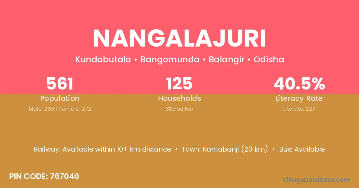 Kantabanji (20 km) is the nearest town to Nangalajuri village for major economic activities and is located approximately 20 km away.