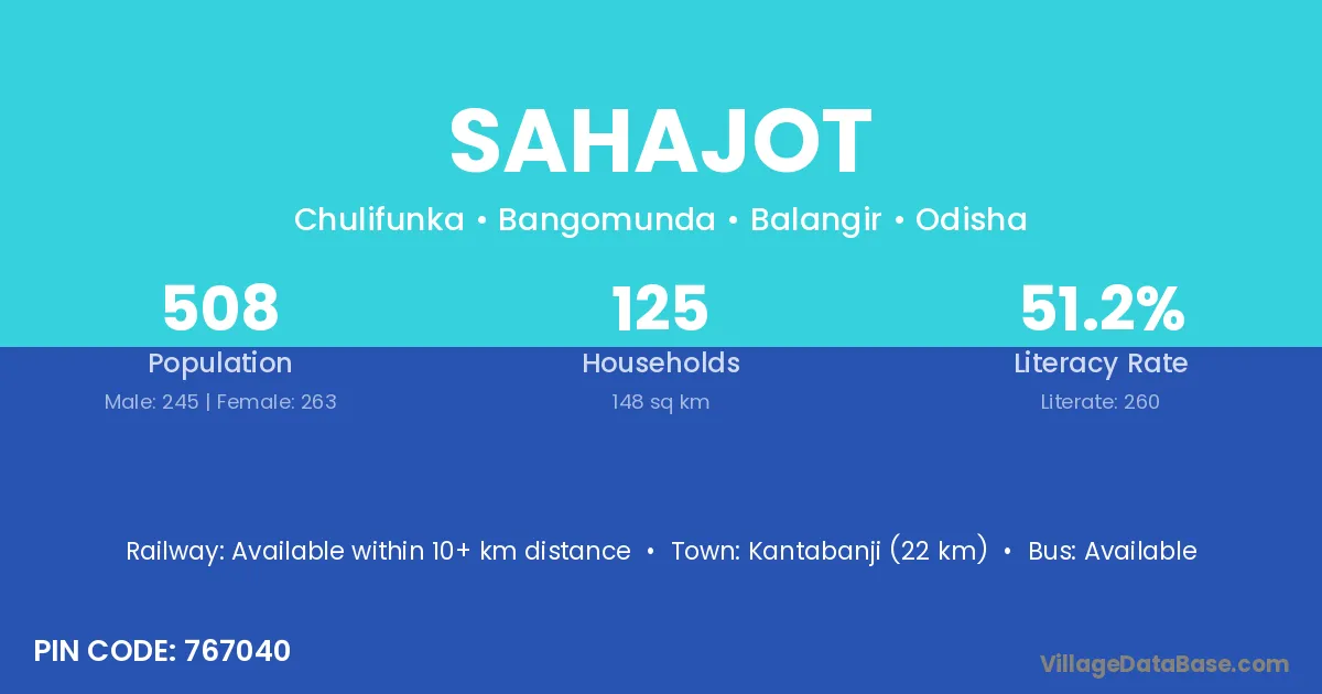 Kantabanji (22 km) is the nearest town to Sahajot village for major economic activities and is located approximately 22 km away.
