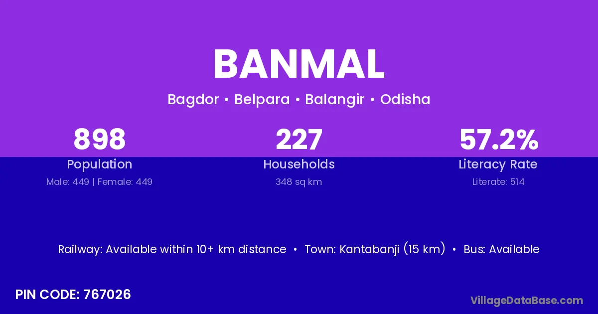 Kantabanji (15 km) is the nearest town to Banmal village for major economic activities and is located approximately 15 km away.