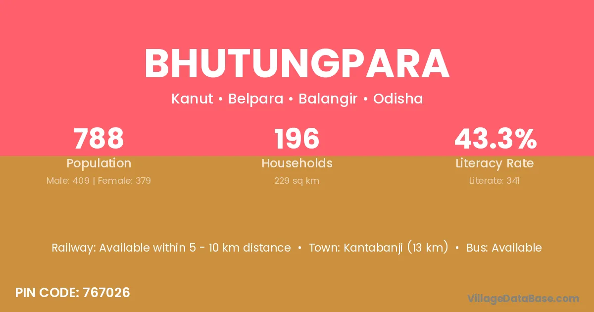 Kantabanji (13 km) is the nearest town to Bhutungpara village for major economic activities and is located approximately 13 km away.