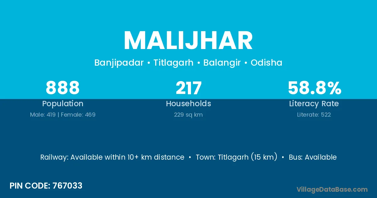 Patnagarh (16 km) is the nearest town to Malijhar village for major economic activities and is located approximately 16 km away.