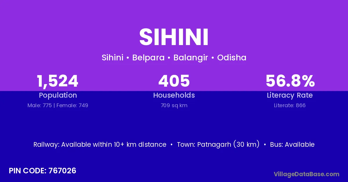 Patnagarh (30 km) is the nearest town to Sihini village for major economic activities and is located approximately 30 km away.