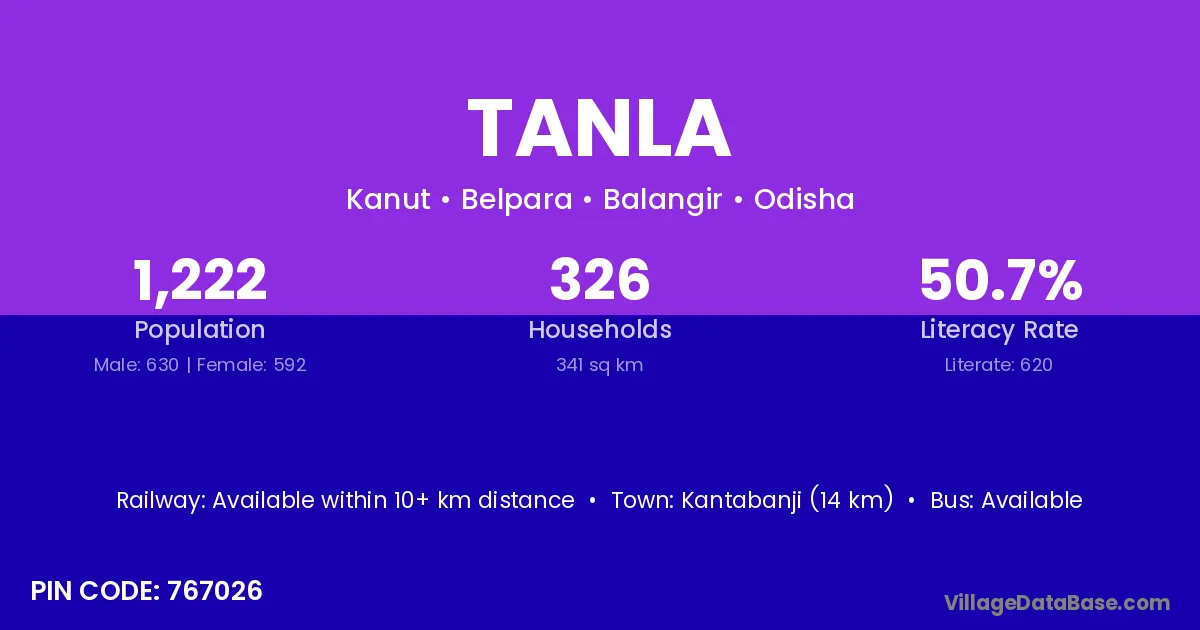 Kantabanji (14 km) is the nearest town to Tanla village for major economic activities and is located approximately 14 km away.