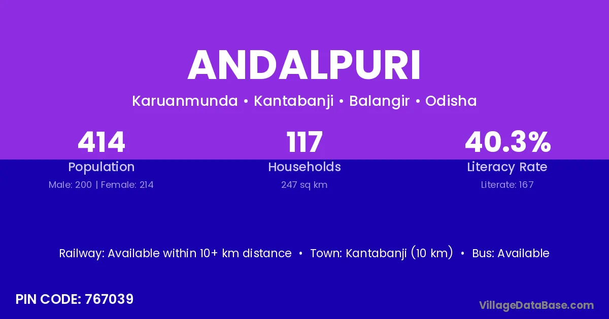 Kantabanji (10 km) is the nearest town to Andalpuri village for major economic activities and is located approximately 10 km away.