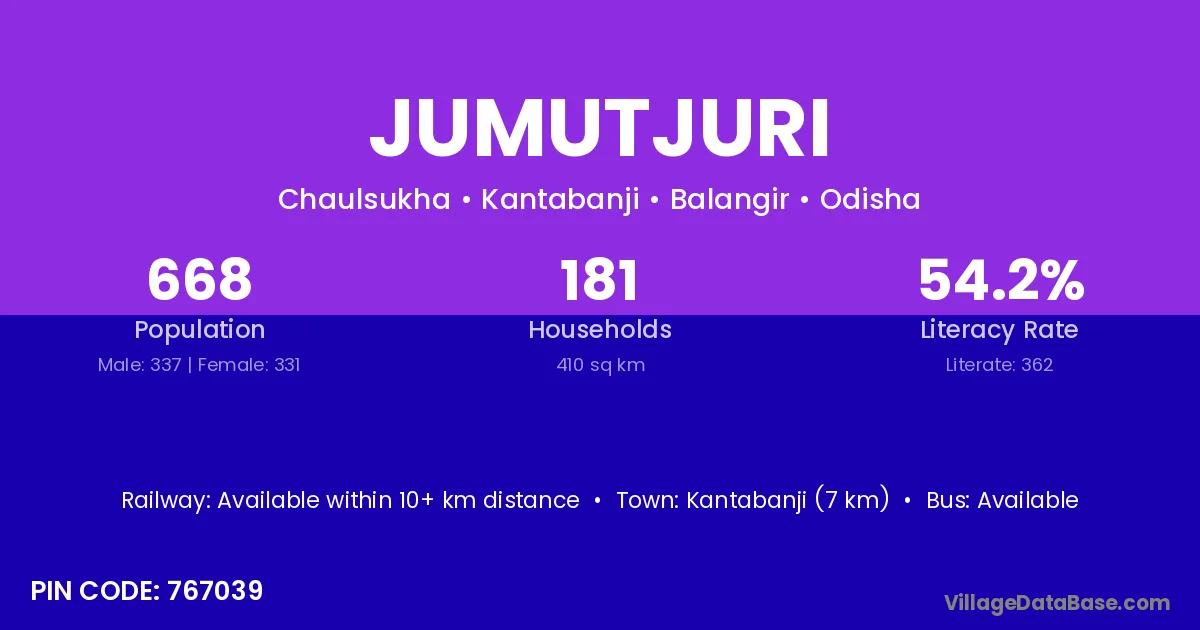 Kantabanji (7 km) is the nearest town to Jumutjuri village for major economic activities and is located approximately 7 km away.