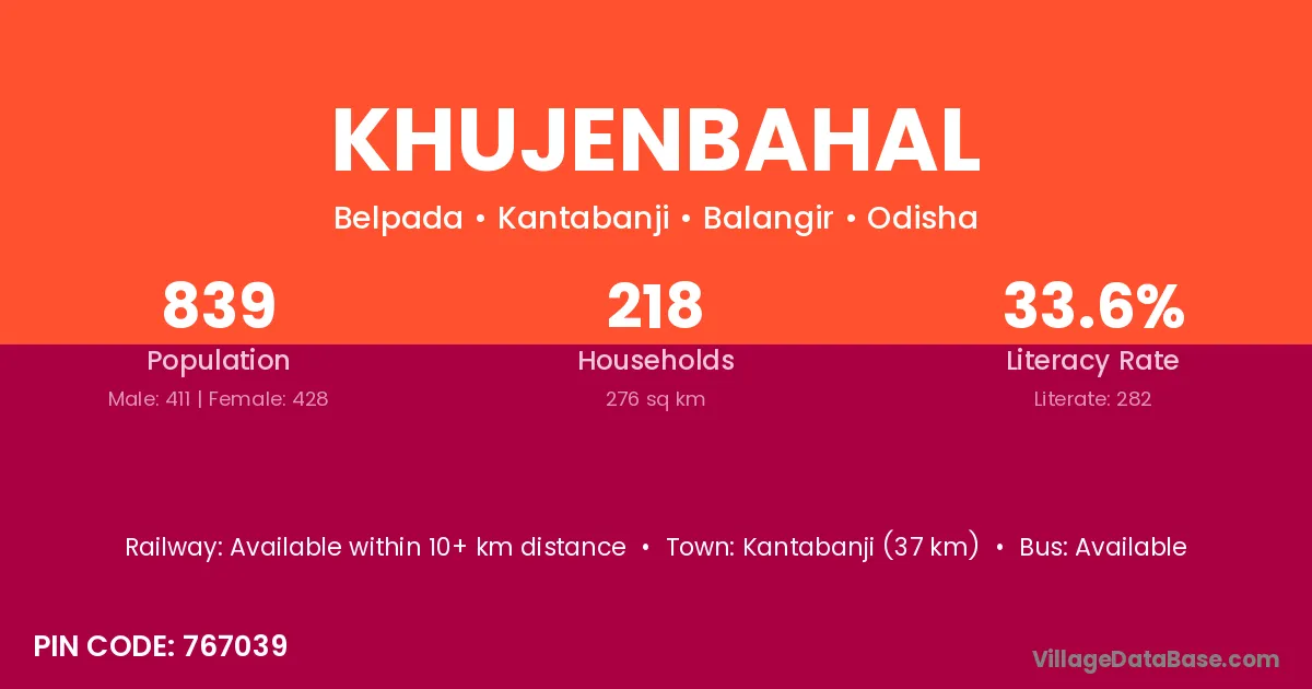 Kantabanji (37 km) is the nearest town to Khujenbahal village for major economic activities and is located approximately 37 km away.