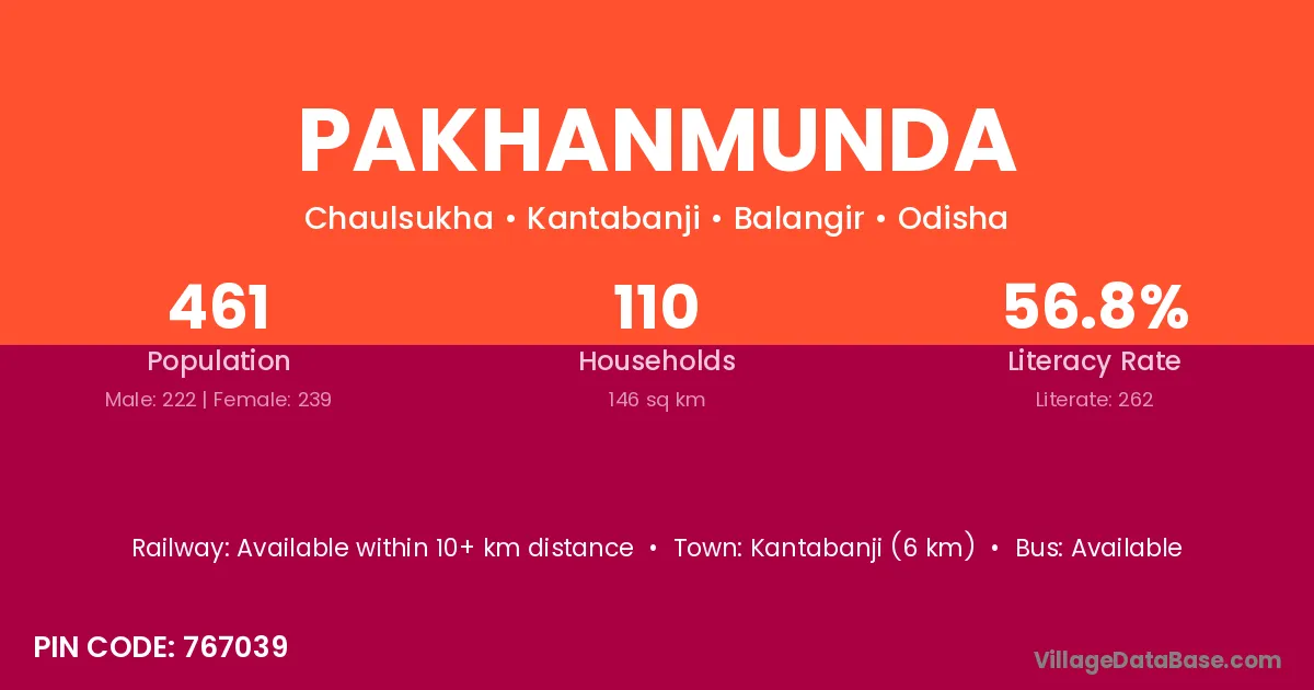 Kantabanji (6 km) is the nearest town to Pakhanmunda village for major economic activities and is located approximately 6 km away.