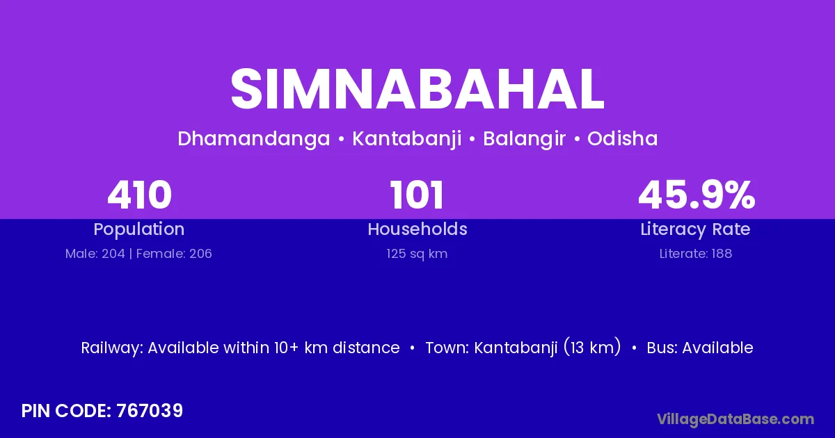Kantabanji (13 km) is the nearest town to Simnabahal village for major economic activities and is located approximately 13 km away.