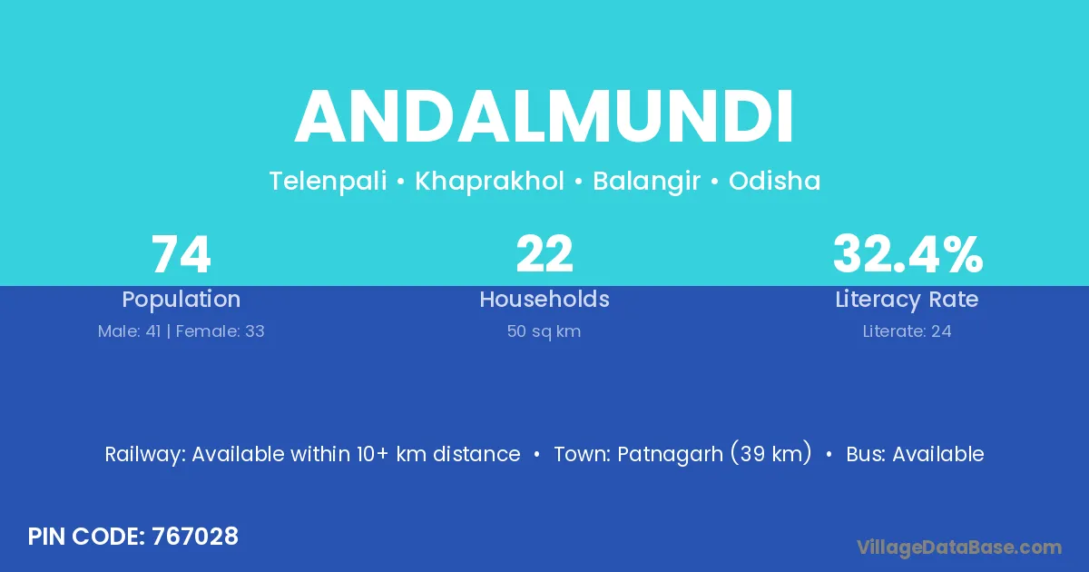 Patnagarh (39 km) is the nearest town to Andalmundi village for major economic activities and is located approximately 39 km away.