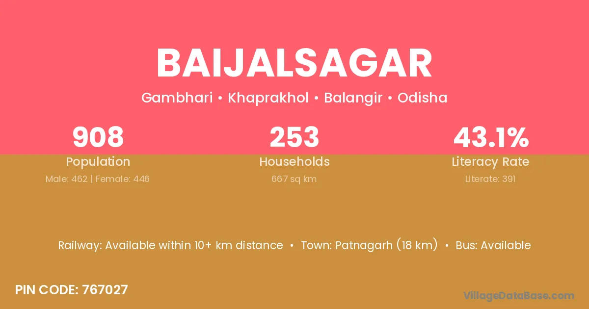 Patnagarh (18 km) is the nearest town to Baijalsagar village for major economic activities and is located approximately 18 km away.