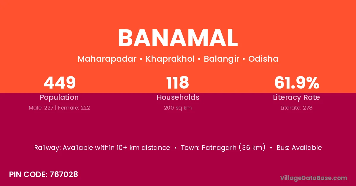 Patnagarh (36 km) is the nearest town to Banamal village for major economic activities and is located approximately 36 km away.
