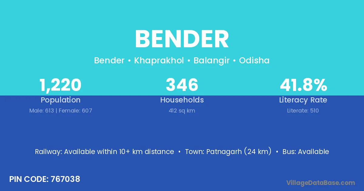 Patnagarh (24 km) is the nearest town to Bender village for major economic activities and is located approximately 24 km away.