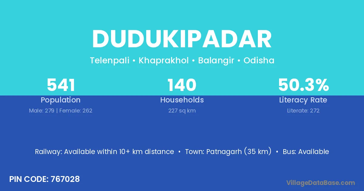 Patnagarh (35 km) is the nearest town to Dudukipadar village for major economic activities and is located approximately 35 km away.