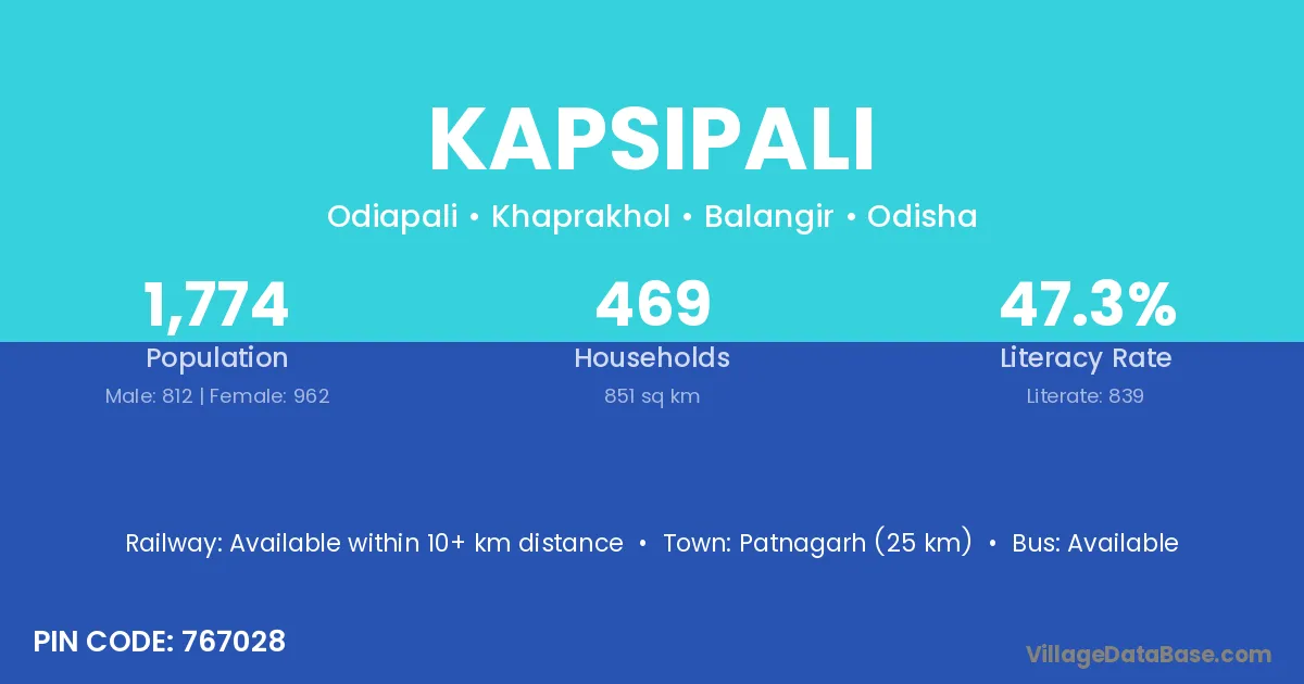 Patnagarh (25 km) is the nearest town to Kapsipali village for major economic activities and is located approximately 25 km away.