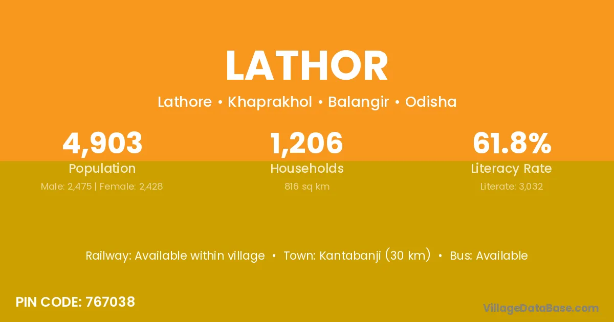 Kantabanji (30 km) is the nearest town to Lathor village for major economic activities and is located approximately 30 km away.
