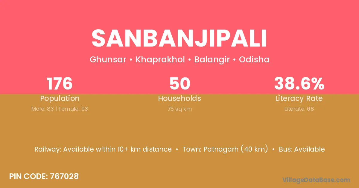 Patnagarh (40 km) is the nearest town to Sanbanjipali village for major economic activities and is located approximately 40 km away.