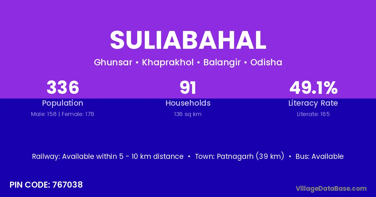 Patnagarh (39 km) is the nearest town to Suliabahal village for major economic activities and is located approximately 39 km away.