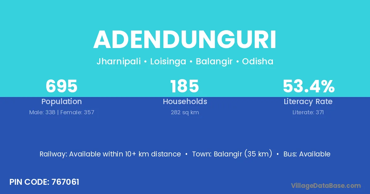Balangir (35 km) is the nearest town to Adendunguri village for major economic activities and is located approximately 35 km away.