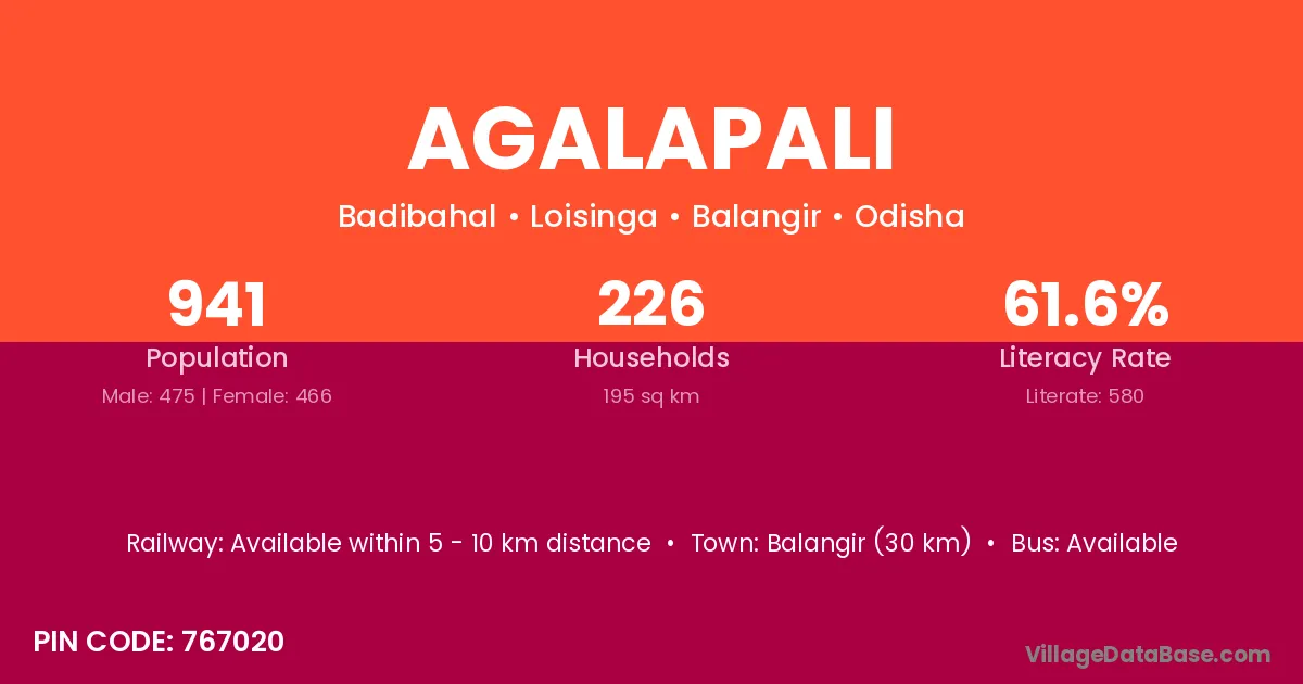 According to Census 2011 information, the village code of Agalapali village is 767020.