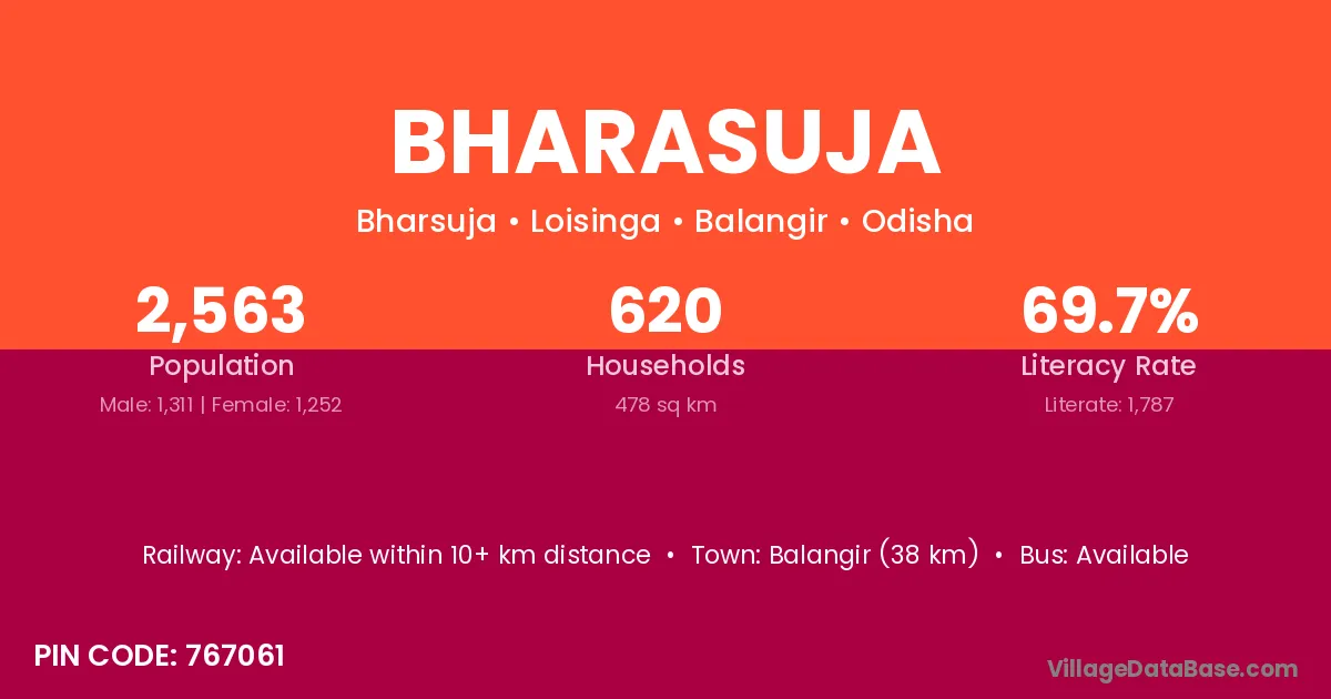 Balangir (38 km) is the nearest town to Bharasuja village for major economic activities and is located approximately 38 km away.