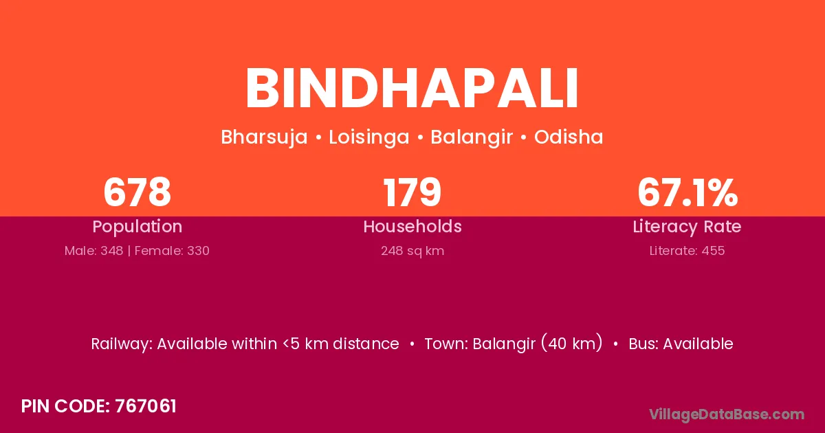 Bindhapali village has a total population of 678 people, of which 348 are males and 330 are females.