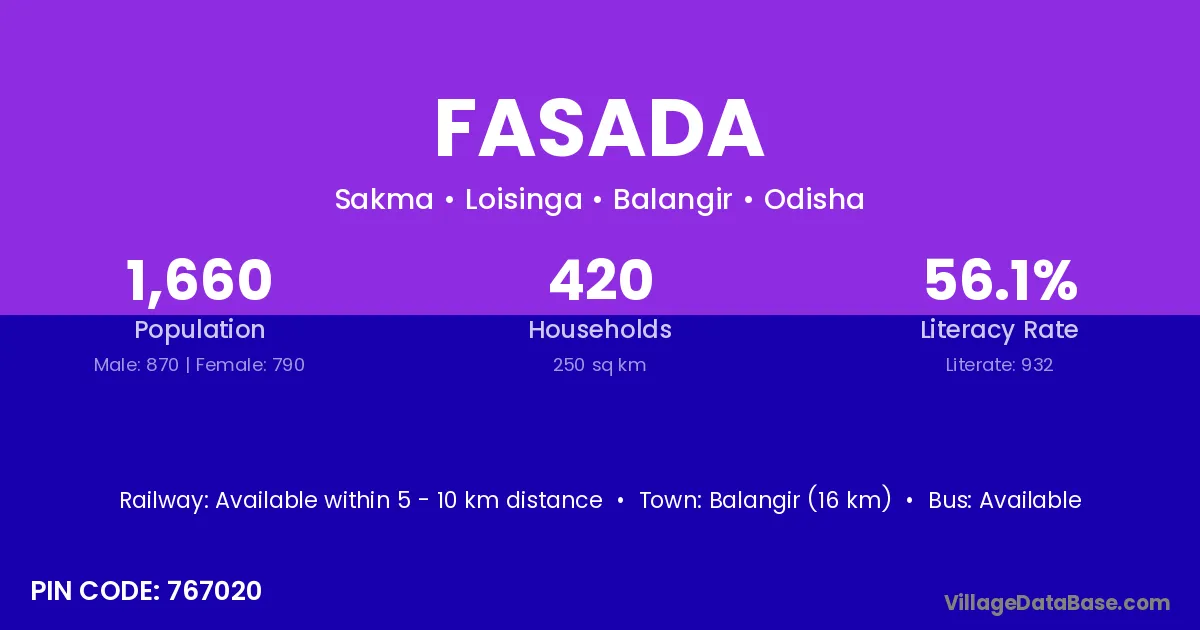 Balangir (16 km) is the nearest town to Fasada village for major economic activities and is located approximately 16 km away.