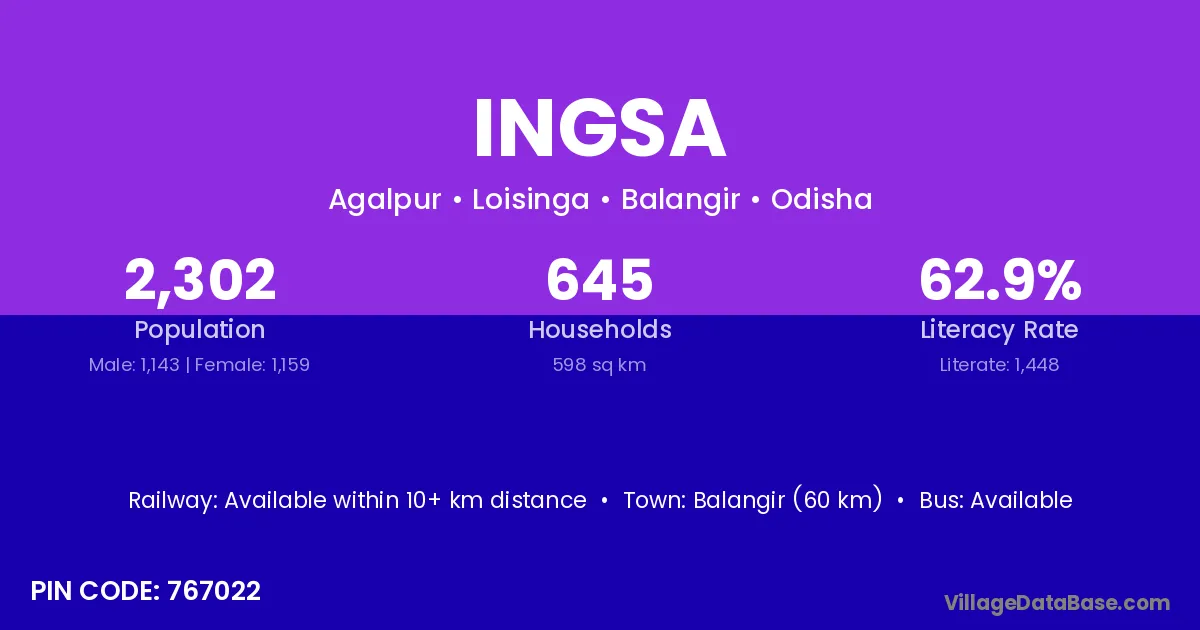 Balangir (60 km) is the nearest town to Ingsa village for major economic activities and is located approximately 60 km away.