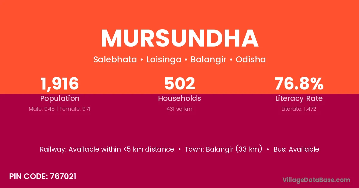 Balangir (33 km) is the nearest town to Mursundha village for major economic activities and is located approximately 33 km away.