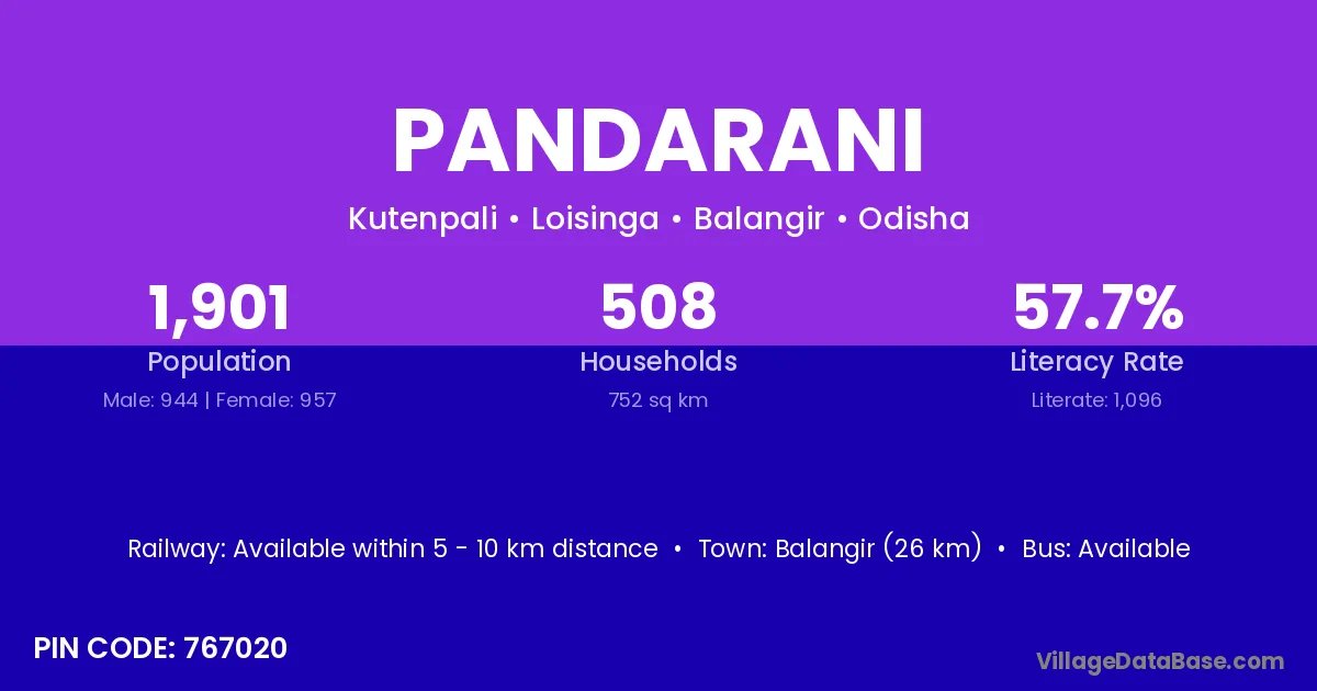 Pandarani village has a total population of 1,901 people, of which 944 are males and 957 are females.