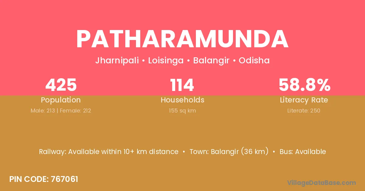 Balangir (36 km) is the nearest town to Patharamunda village for major economic activities and is located approximately 36 km away.