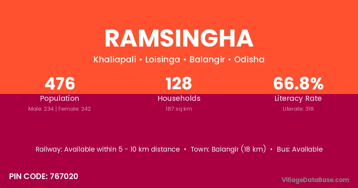 Balangir (18 km) is the nearest town to Ramsingha village for major economic activities and is located approximately 18 km away.