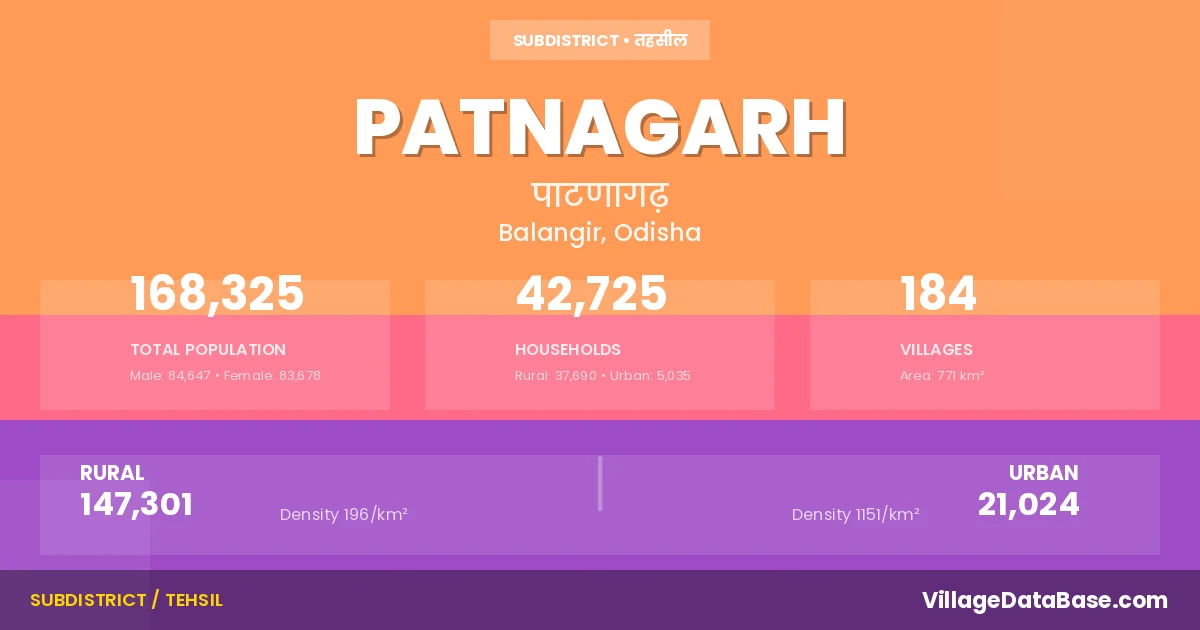According to the 2011 census The total area of Patnagarh Tehsil is 771 km², with a population of 168325 people. The population density is 218 inhabitants per square kilometre, and there are approximately 42725 houses in the sub district.