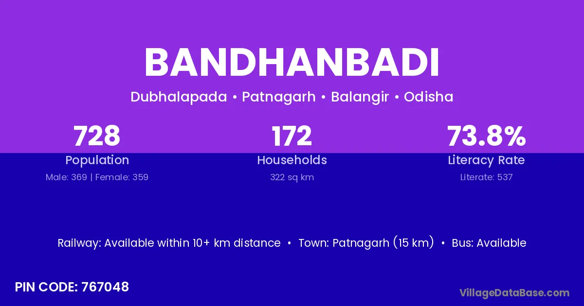 Patnagarh (15 km) is the nearest town to Bandhanbadi village for major economic activities and is located approximately 15 km away.