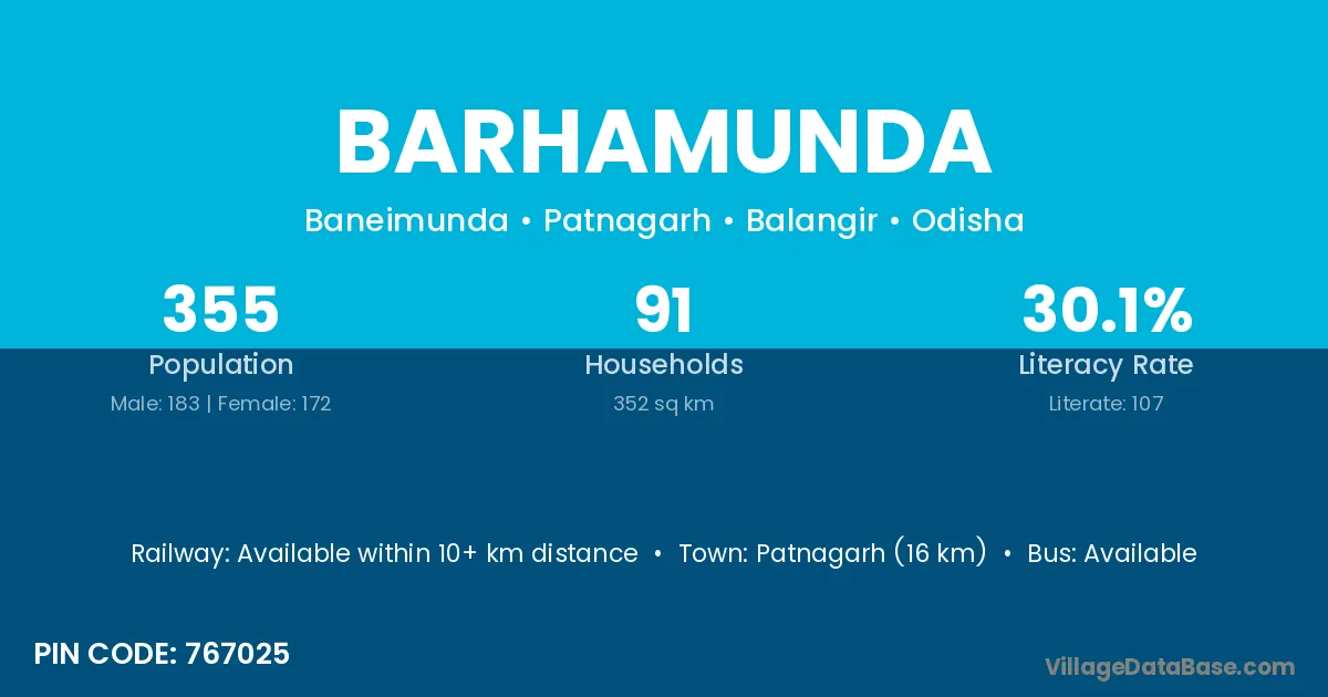 Patnagarh (16 km) is the nearest town to Barhamunda village for major economic activities and is located approximately 16 km away.
