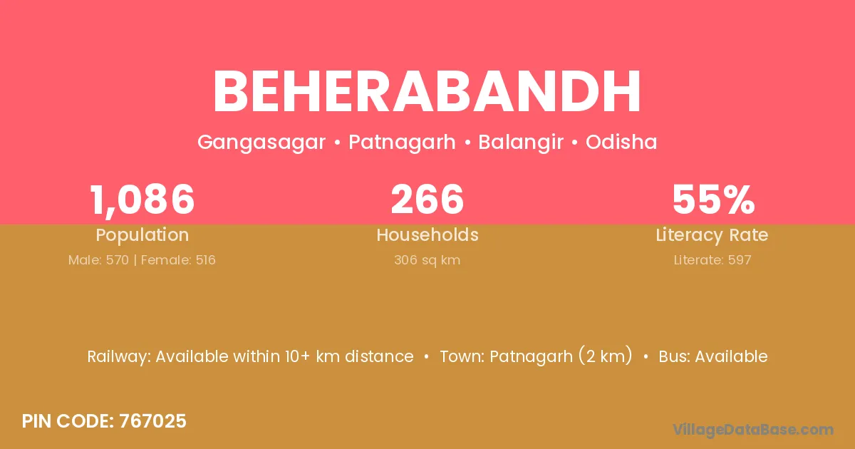 Patnagarh (2 km) is the nearest town to Beherabandh village for major economic activities and is located approximately 2 km away.