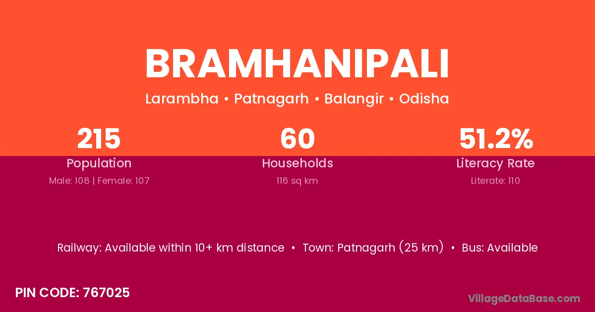 Patnagarh (25 km) is the nearest town to Bramhanipali village for major economic activities and is located approximately 25 km away.
