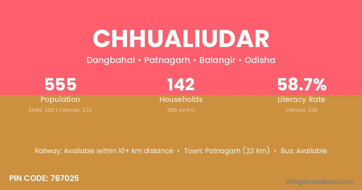 Patnagarh (23 km) is the nearest town to Chhualiudar village for major economic activities and is located approximately 23 km away.