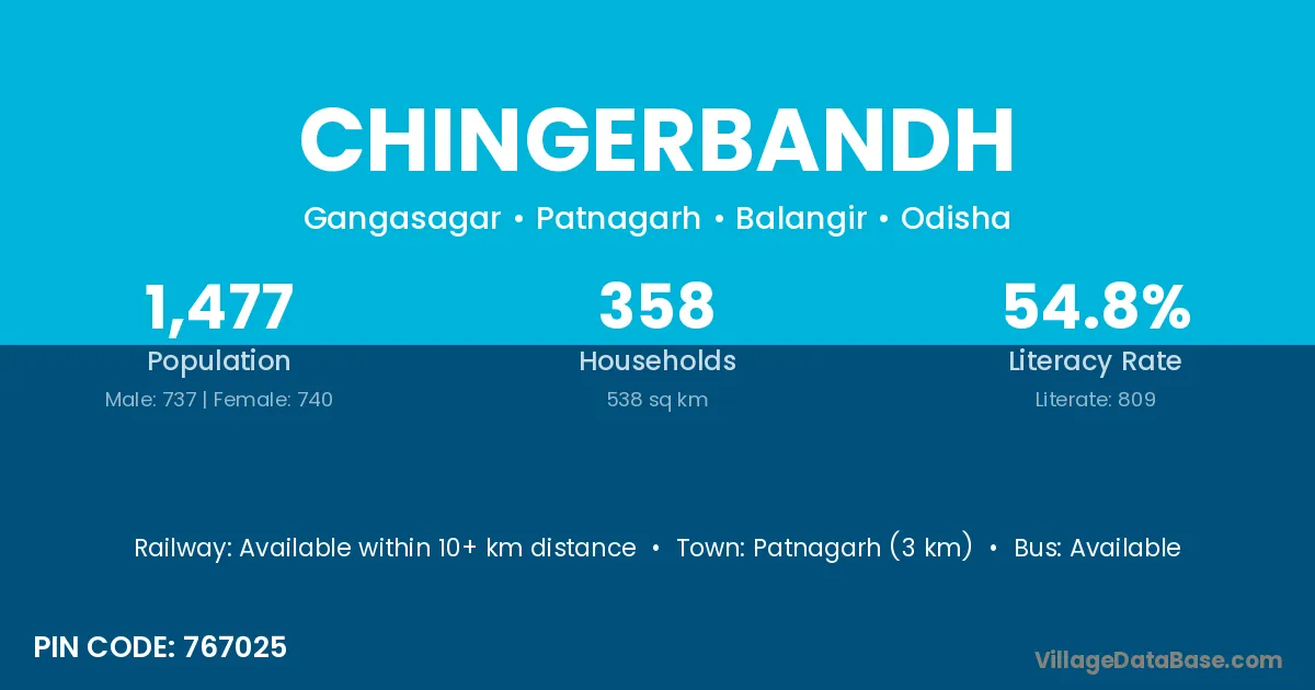 Chingerbandh village has a total population of 1,477 people, of which 737 are males and 740 are females.