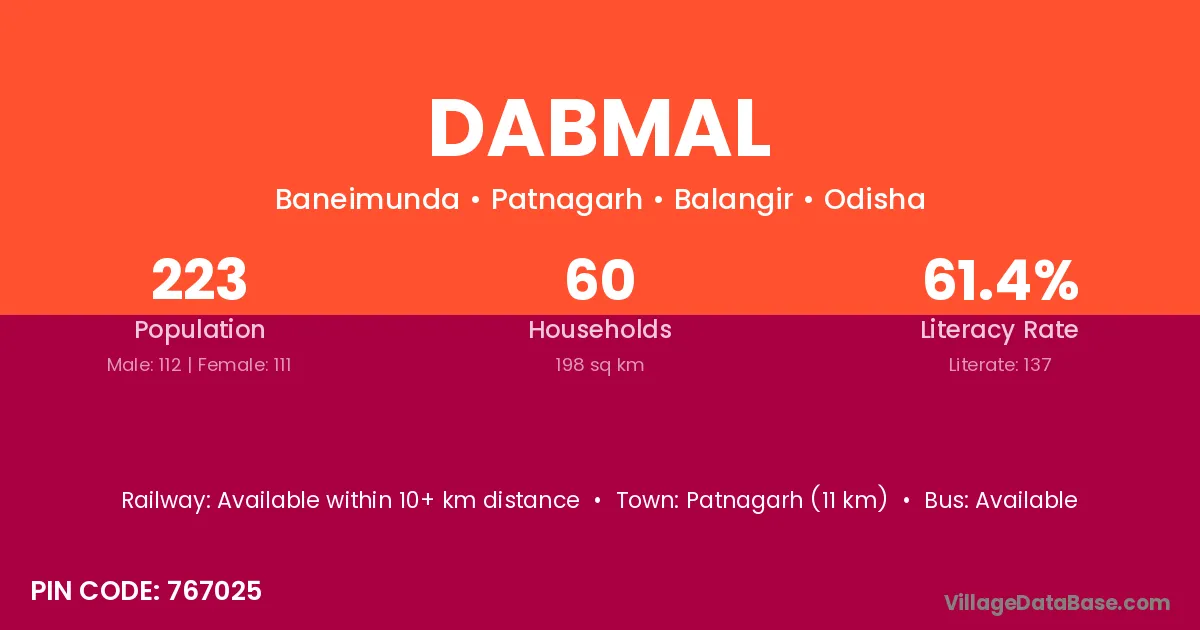 Patnagarh (11 km) is the nearest town to Dabmal village for major economic activities and is located approximately 11 km away.