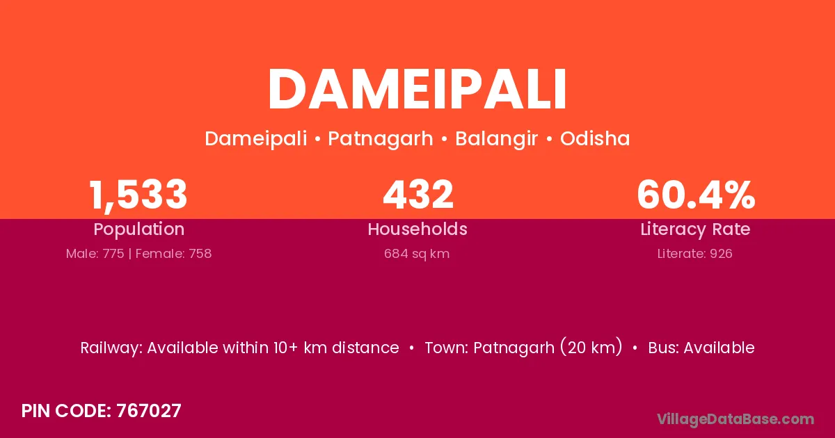 Patnagarh (20 km) is the nearest town to Dameipali village for major economic activities and is located approximately 20 km away.